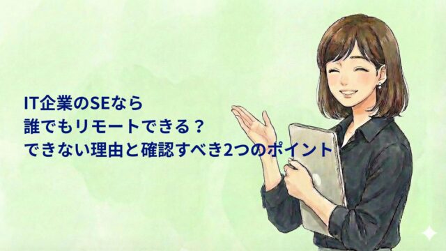 就活ノウハウ IT企業のSEなら誰でもリモートできる?できない理由と確認すべき2つのポイント 2026年1月6日 pm.se.career@gmail.com 結城まな こんにちはプロジェクトSEの仕事図鑑へようこそ! プログラミング未経験で、大手IT企業に入社しました。現在はプロジェクト …