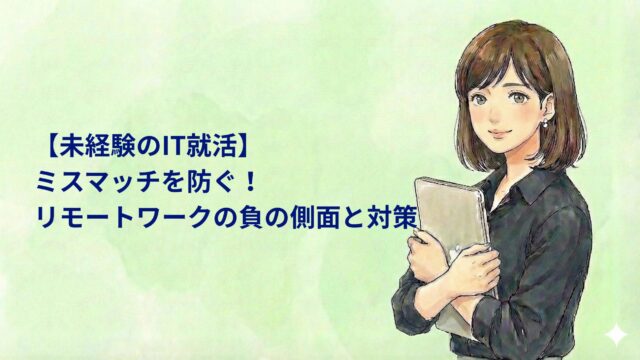 働き方・キャリア 【未経験のIT就活】ミスマッチを防ぐ!リモートワークの負の側面と対策 2026年1月9日 pm.se.career@gmail.com 結城まな こんにちはプロジェクトSEの仕事図鑑へようこそ! プログラミング未経験で、大手IT企業に入社しました。現在はプロジェクト …