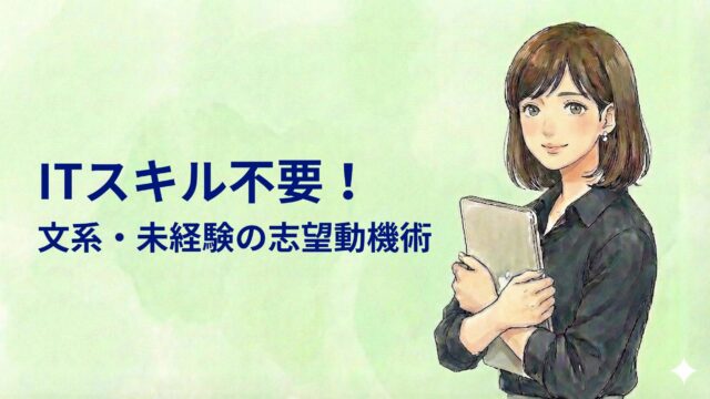 就活ノウハウ 【文系・未経験】ITスキル不要!「日常の体験」で作る最強の志望動機 2026年1月14日 pm.se.career@gmail.com 結城まな こんにちはプロジェクトSEの仕事図鑑へようこそ! 私はプログラミング未経験で、大手IT企業に入社しました。現在はプロジェ …
