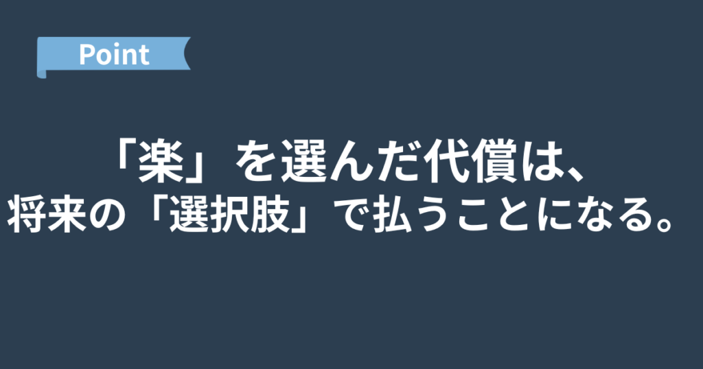 - 長期: スキルがつかず、キャリアの選択肢が消えるリスクがあるから